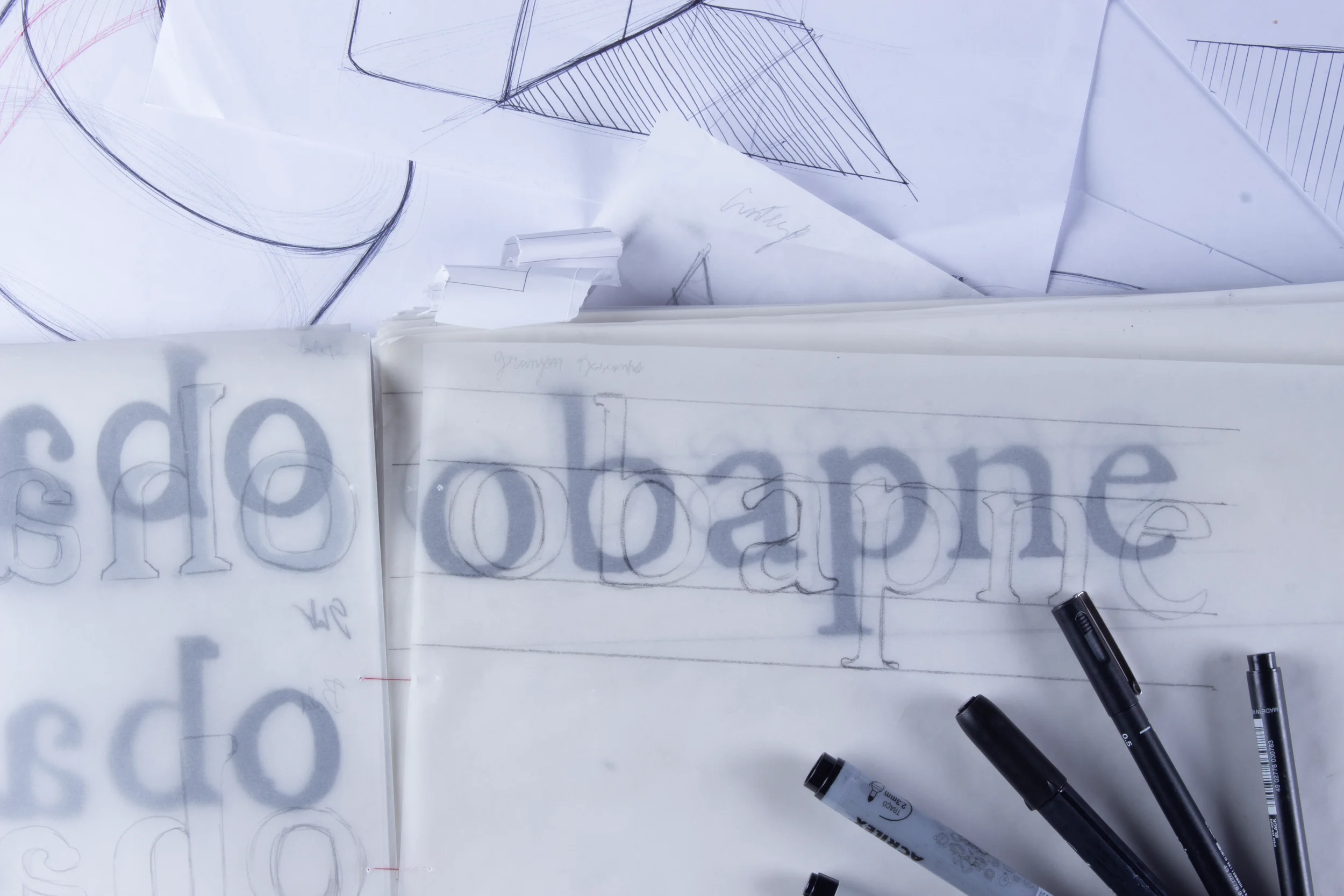 O grupo se dividiu na criação de 4 variações da família tipográfica, sendo eu majoritariamente responsável pela variação em caixa baixa. As primeiras versões da fonte foram originalmente rascunhada em papel se baseando nos cortes, depois vetorizada no Adobe Illustrator. Os arquivos .svg então foram passados para a plataforma Glyphr, que transformou os vetores em uma familia tipográfica.
